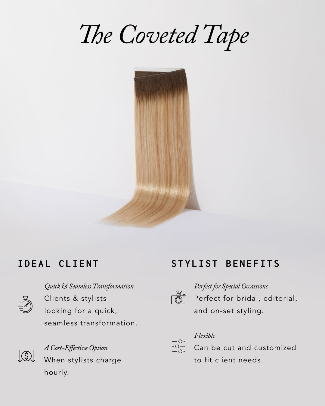 For clients who need a fast yet flawless transformation, The Coveted Tape Collection is the perfect solution. This method provides volume and length with a quick installation process, making it ideal for busy clients or editorial and bridal styling. Stylists can cut and customize tape wefts for a tailored fit, ensuring a natural blend while offering a time-efficient alternative to traditional methods.