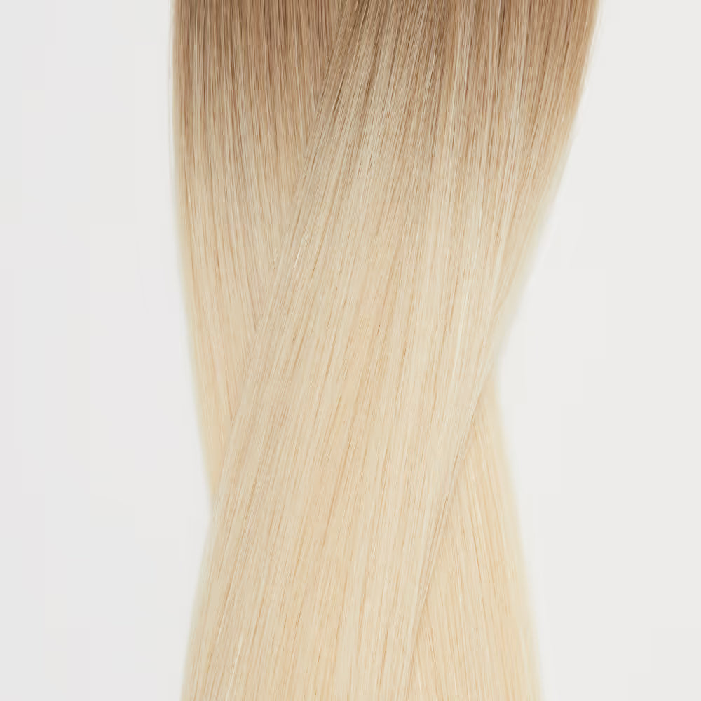 The Laguna Blonde Baby Root features a ¼” medium-ashy blonde tap root. This baby root is perfect for your clients that want to achieve a fully highlighted look without the appearance of significant regrowth, offering a fresh and polished look. The strategic placement of the baby root ensures that the transition from root to tip is gradual and natural, enhancing the overall highlighted effect.