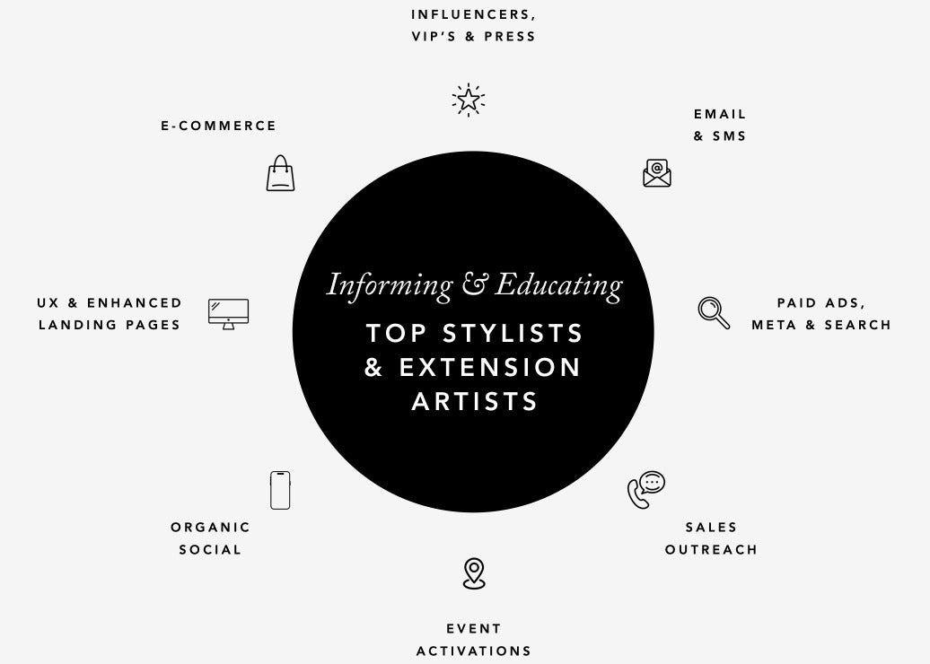 We connect with top stylists, influencers, and VIPs through targeted email and SMS campaigns, paid ads, and engaging social media content. Our strategy includes event activations, enhanced landing pages, and a robust e-commerce presence to inform and educate our audience effectively.